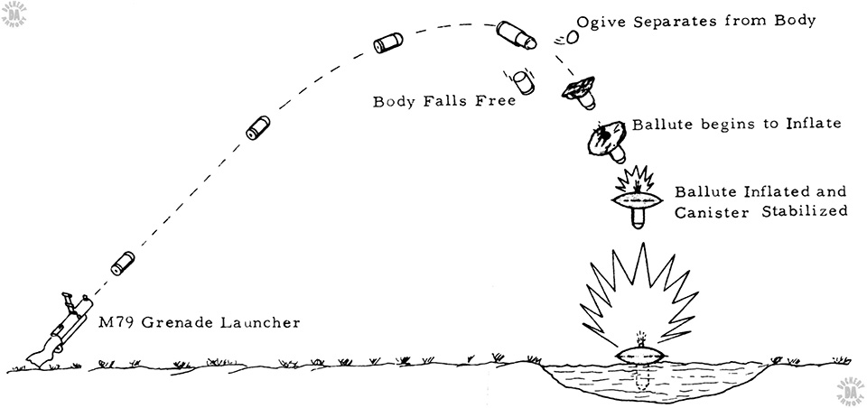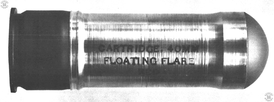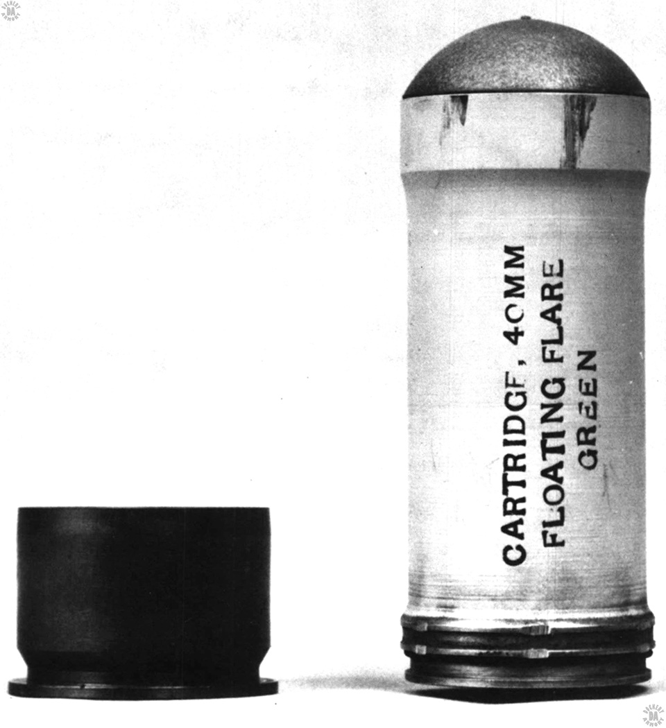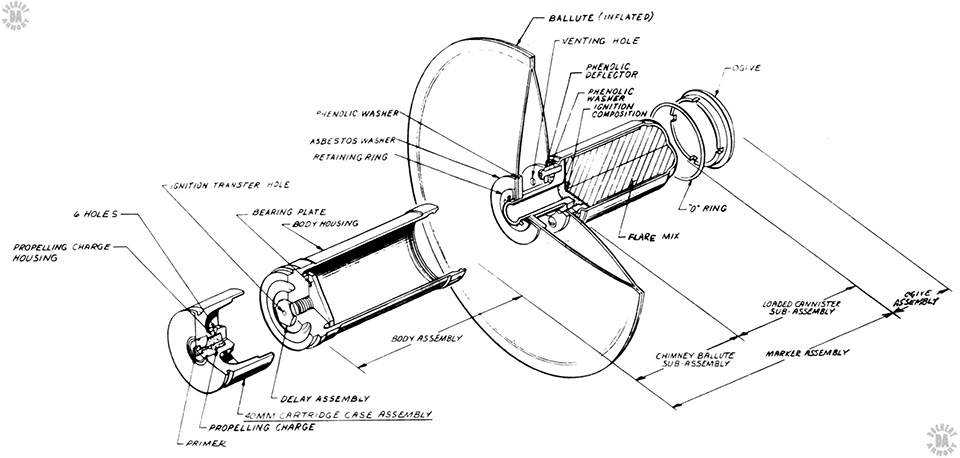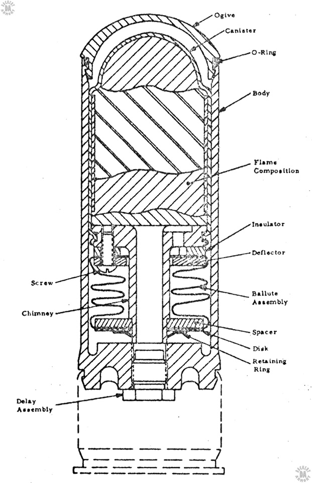 PROJECTILE TYPE – Round-nosed aluminum-bodied two-piece projectile with yellow, red, or green flare composition and 15.2 cm (6 in) diameter ballute