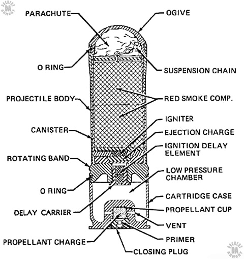 EFFECT – Smoke charge burns for 90 seconds after ejection from projectile body creating a large cloud of red smoke at treetop level