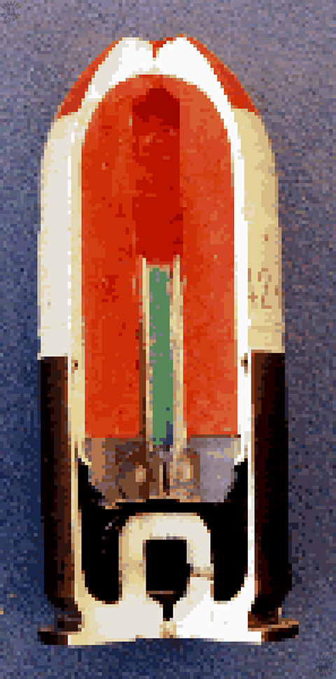 IDENTIFYING COLOR CODE – Green cartridge case with black ink markings, Silver projectile body with black ink markings, Flat-pointed ogive with red-painted tip