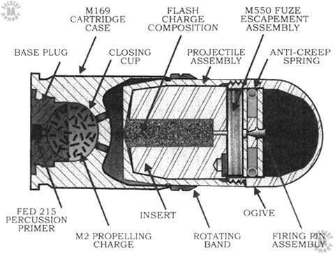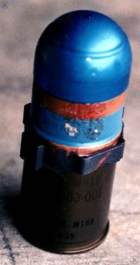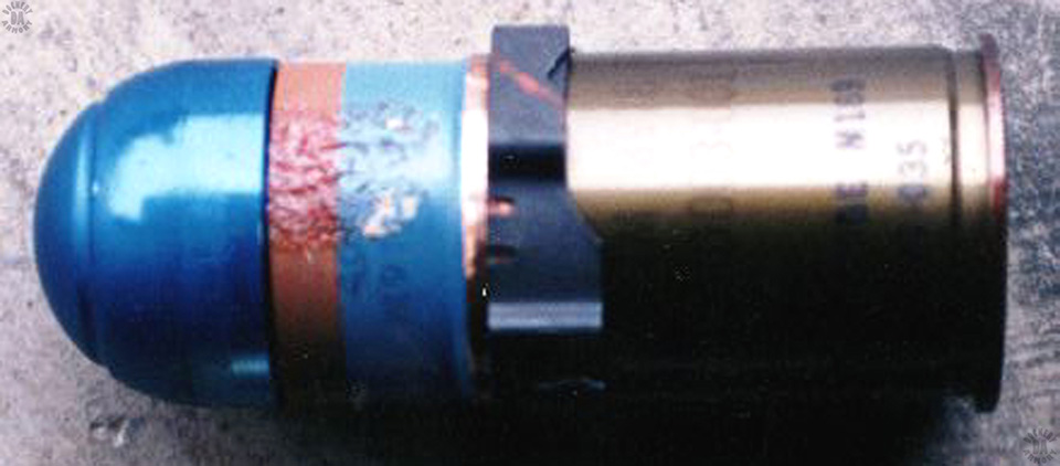 IDENTIFYING COLOR CODE – Projectile is blue with black markings and 1 brown band below the ogive, ogive is blue with 1 annular groove below nose, unpainted copper rotating band cartridge case is green with yellow markings