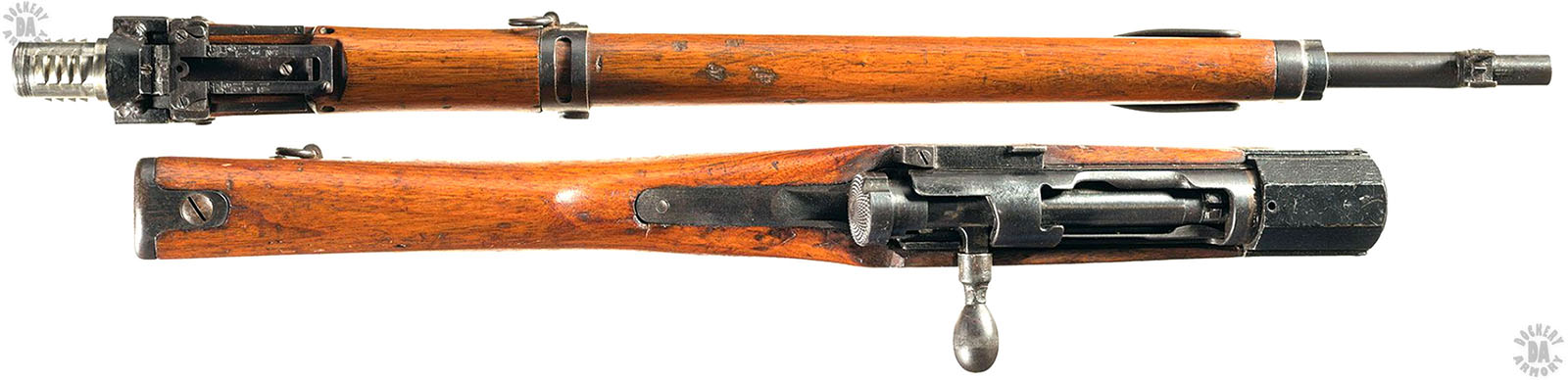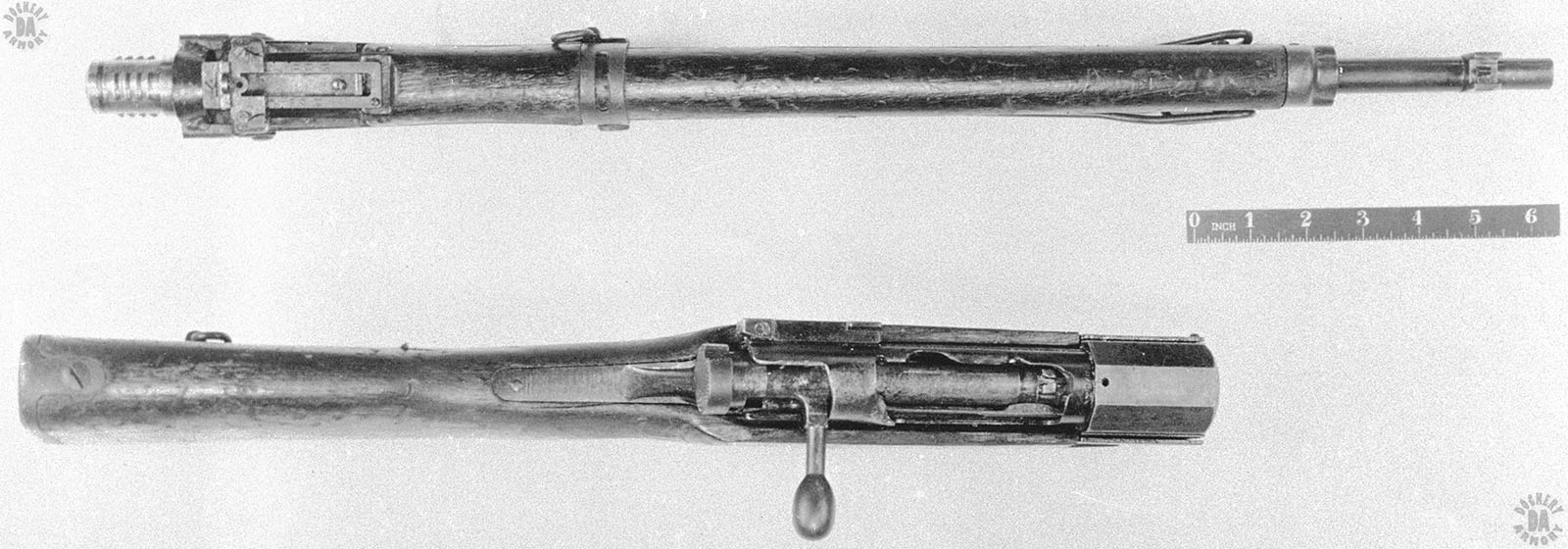 SIGHTS – Open, Iron, Adjustable, Front sight – Inverted V-blade, Rear sight – Battle sight – V-notch to 300 meters (328 yards), V-notch ladder, Adjustable from 300 to 1500 meters (328 to 1640 yards) in 100 meter (109 yard) increments, folding Antiaircraft lead “wings” on either side of rear sight ladder when raised.