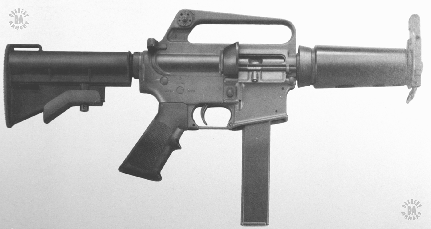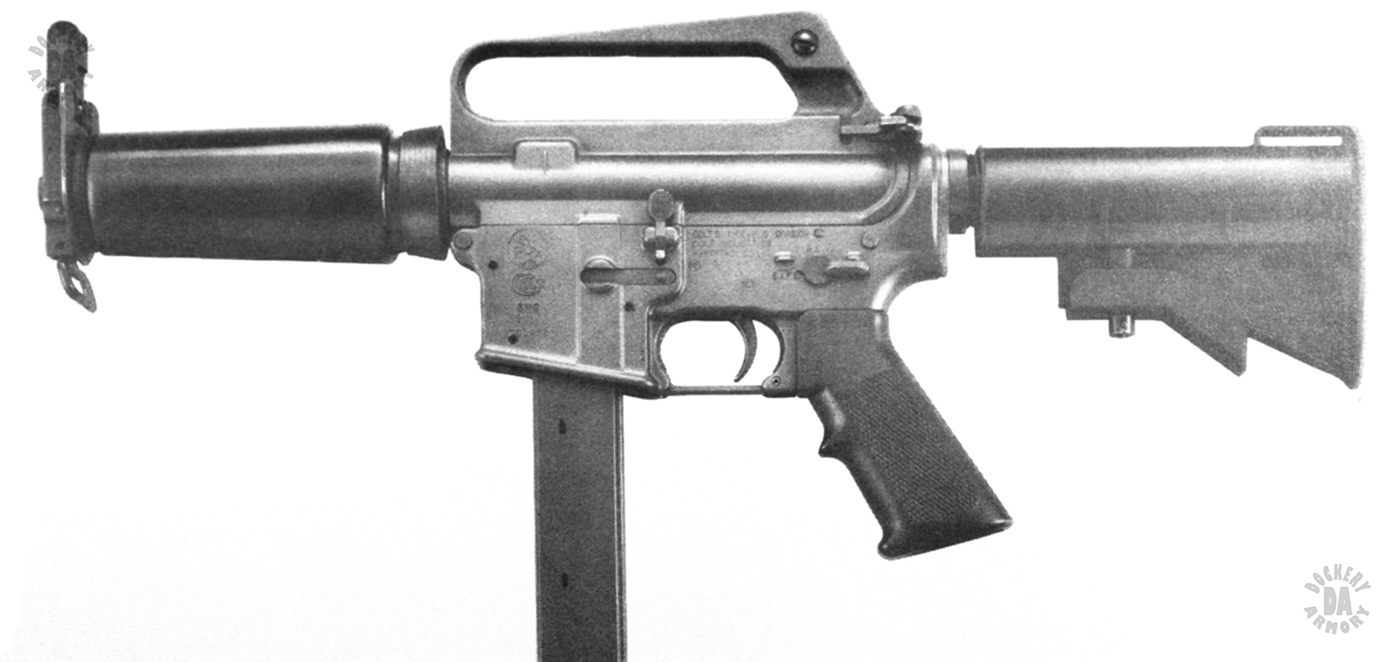The smallest version of the Colt 9mm submachinegun family was made to fulfill a Department of Energy request for a compact weapon for use around Nuclear Facilities. All of the aspects of the Colt 9mm submachineguns were retained in the Model 633HB with the addition of a short barrel. In spite of the barrel being shorter than the earlier Colt 9mm weapons, it is still the same basic length as most of the world’s 9mm submachineguns. The hand guard was redesigned so as to protect the operator’s hand from slipping forward when firing. The front sight base also acts as a front hand stop besides supporting the collapsible front sight. Addition of the hydraulic buffer helps keep the cyclic rate of fire of the compact weapon down to more manageable levels.