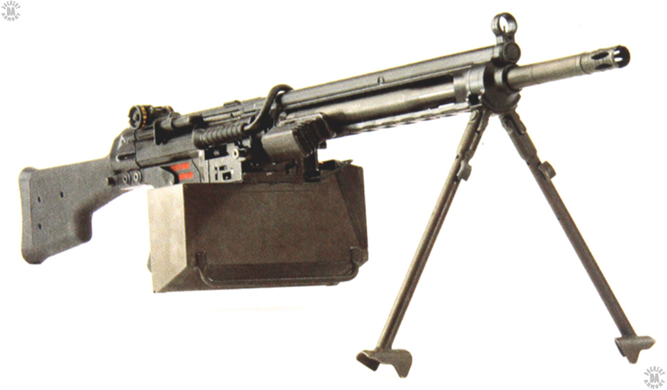 WEIGHT (MOUNTED) – 12.54 kg (27 lb 10 oz) with bipod, sling, support grip, loaded with belt box holding 100-round belt M80 ball