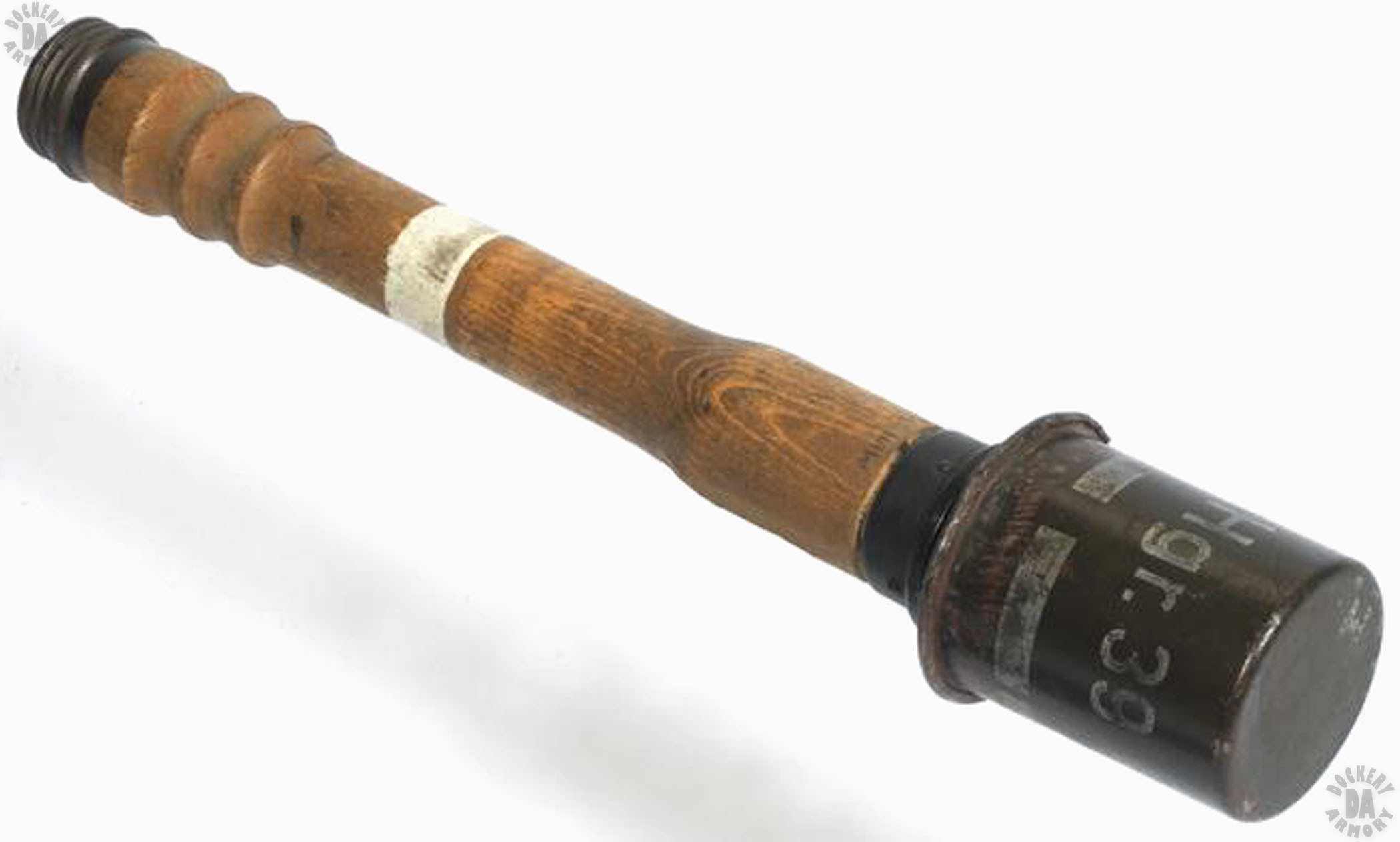 MARKINGS – Field grey metal head and handle cap, “Nb. Hgr. 39B” in white letters on grenade head, 4 1 cm (0.39 in) wide white stripe sections under printing, 2 cm (0.79 in) white strip in middle of handle