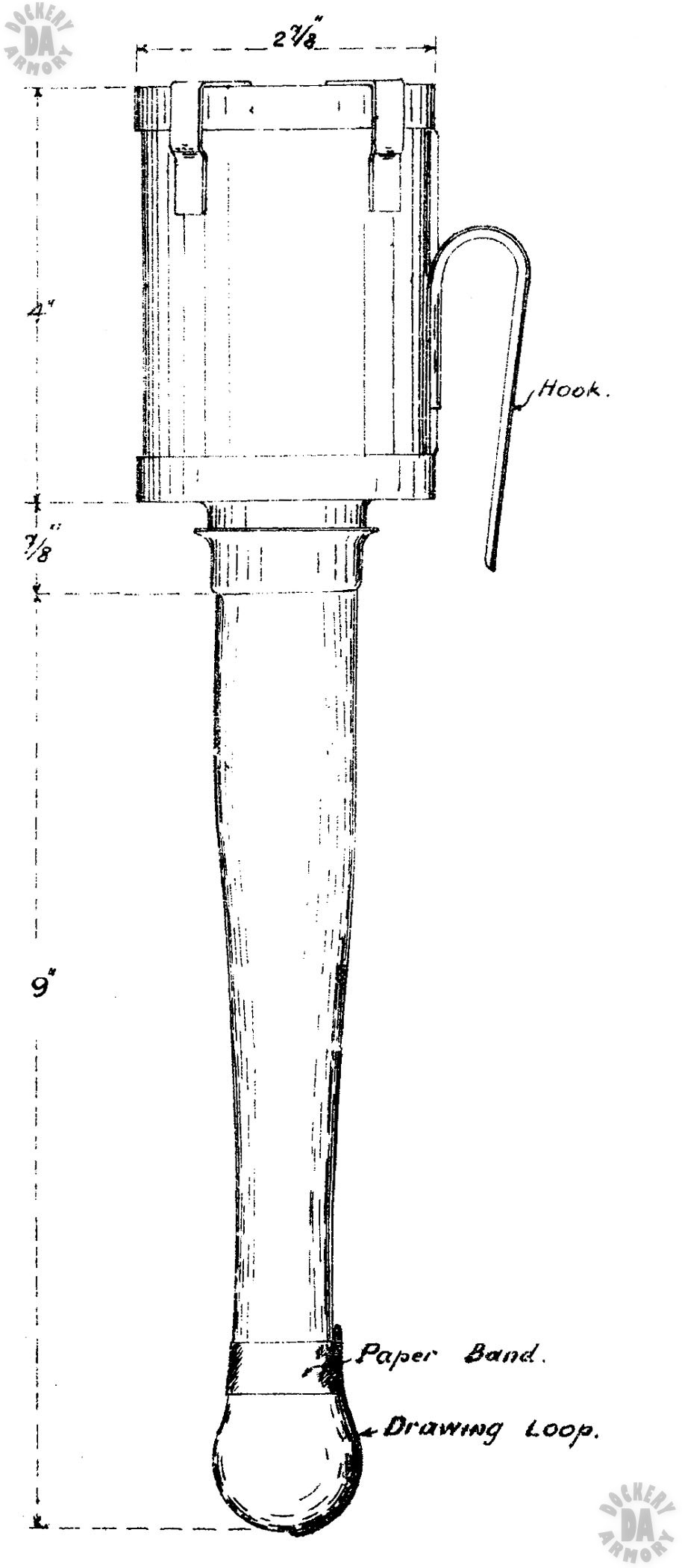 The basic layout of the Model 1915 stick grenade set part of the standard for the German stick grenades to follow. But it had some serious drawbacks that showed that it had been designed without the environment of Trench Warfare being considered. The ignition pull string and ring at the bottom of the handle could easily hang up when a soldier was moving, or especially crawling, while under fire. And the ring would often come loose as it was only secured to the bottom of the grenade’s handle by a strip of red paper. The paper would not survive long in the muddy environment of the trenches.