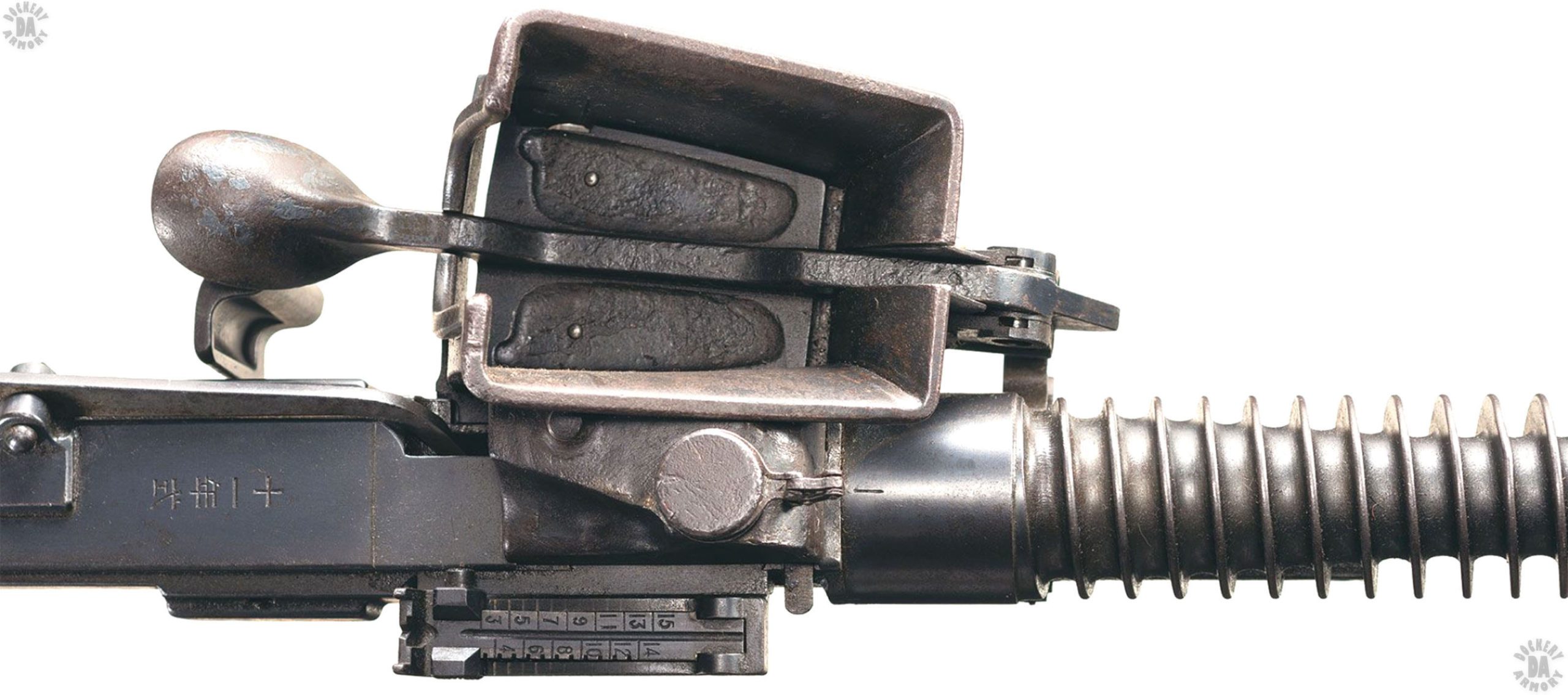 SIGHTS – Open, iron, adjustable, Front sight – Inverted V-blade, adjustable for windage, Rear sight – Tangent with V-notch, adjustable for range, graduated from 300 to 1,500 meters (328 to 1640 yards), Sight offset to right side of weapon